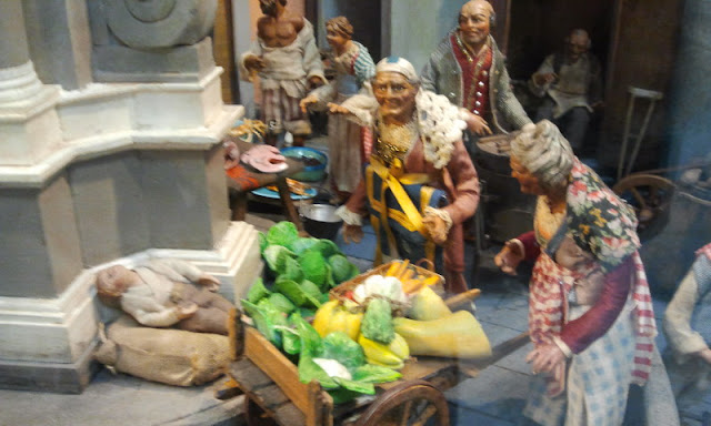 Pero conviene ahondar un poco más en por qué este arte coge sus raíces en esta ciudad tan particular. El Pesebre cristiano es prácticamente una tradición franciscana, que surge como representación del Nacimiento de Cristo, y obviamente , en el Siglo XIII, era hecho de un modo austero, ciñéndose al nacimiento propiamente dicho, con las figuras bíblicas. En el 700, esta representación, coge fuerza en Nápoles, coincidiendo con las excavaciones que descubren la vida Romana que esta ciudad campana lleva en sus entrañas, y surge toda esta recreación sobre el nacimiento de Cristo.