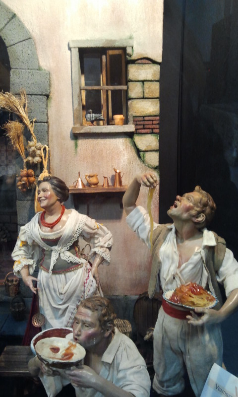Los Pesebres Napolitanos están llenos de representaciones de mercados callejeros, de tavernas, de casas populares, y también de escenas marineras. En una época, como el 700 , en la cual se pasaba hambre, en los pesebres sin embargo, hay una sobreabundancia de comida.. Incluso hay Spaghettadas.